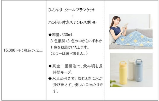 ・15,000円<税込>以上購入で「ひんやり クールブランケット」と「ハンドル付きステンレスボトル」の2アイテム