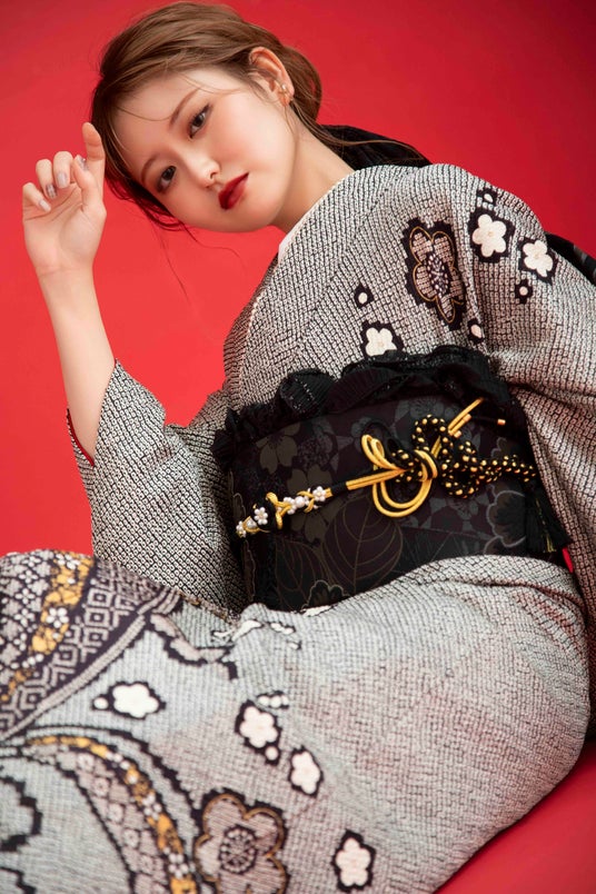 ヘアは、作り込みすぎない緩やかなポニーテール。前髪もあえて整えすぎず、柔らかな動きを残すことで、成人という節目に立つ自然体の強さを出しています。