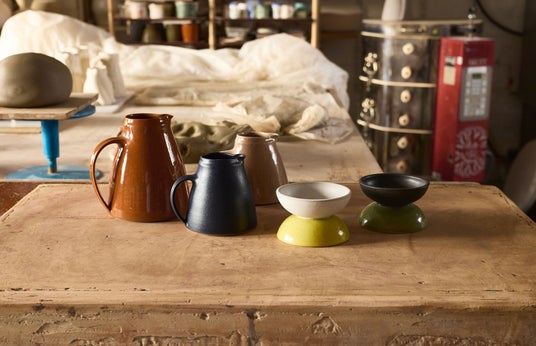 今回のコレクションには、手仕事ならではの表情を感じさせる灰釉、オレンジ釉をアレンジした「トマト」、そして全体の色調に深みを加えるために開発した濃紺の釉薬が含まれており、ジャグのハンドルは、一点ずつ手作業で引き成形し、本体に取り付けています。また、筆の勢いや手の動きを生かした自由な一筆で描かれたコバルトブルーのボウルやジャグ。そして、光沢のある釉薬とマットな素地の対比によって表現された「まばたき」のデザインは、片側は目を開け、もう片側は閉じた表情で、瞬間的な動作と緻密な制作工程とのコントラストを表したサイダージャグが揃います。