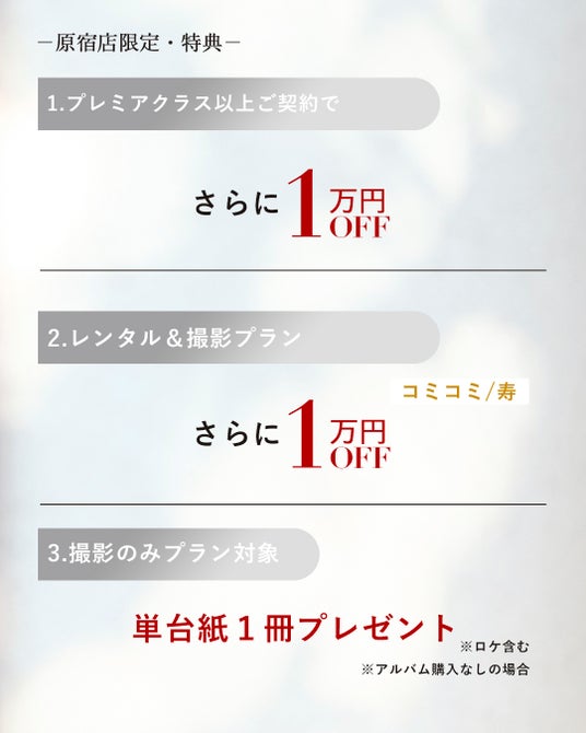 原宿店では共通特典に合わせてさらにお得な割引特典をご用意!