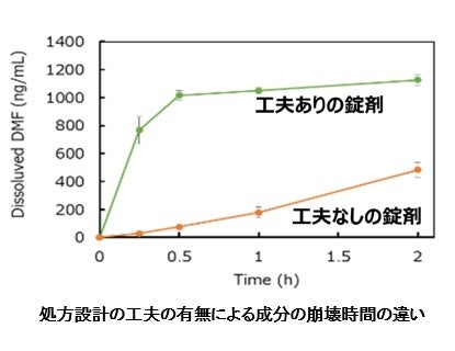 その結果、水の中では問題なく溶けるキトサン配合錠は、酸性の環境では表面にゲル層※3ができ、中の成分が溶けにくく、消化管の中で働きにくくなる可能性が分かりました。そこで、キトサンの加工方法や、酸性を打ち消す性質を持つ素材との組み合わせなど、処方上の工夫をしました。その結果、酸性の環境でも安定して崩壊する錠剤の設計に成功しました(下グラフ)。