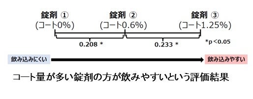 錠剤の表面にコーティング膜を設けることで錠剤の苦みを軽減することは、一般的に用いられる手法として知られています。本研究では、このコーティング膜の厚さによって飲みやすさが変化するかどうかを確認しました。コーティング剤の錠剤重量に占める割合を0%から1.25%まで変化させて評価した結果、コーティング量が増えるほど飲みやすさが高まることを明らかにしました(下図)。
