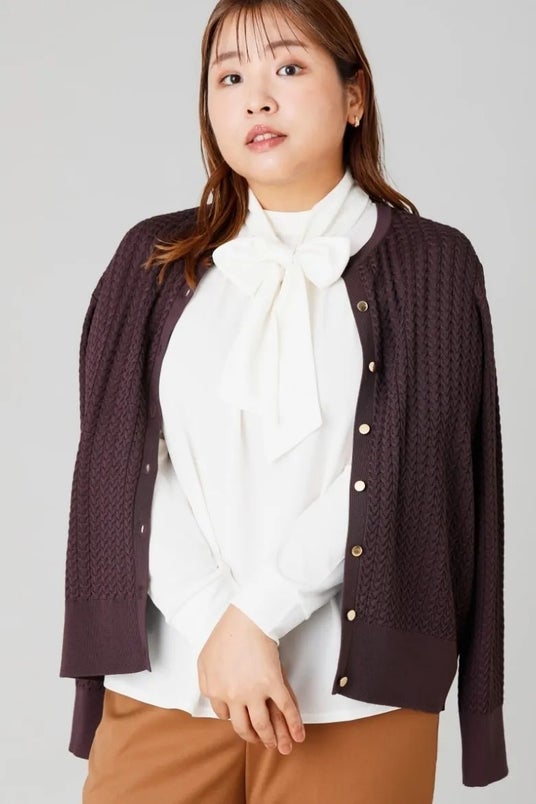 洗濯機洗いOKでシワになりにくいブラウス見えカットソーは、忙しい毎日に頼れるアイテム。リボン結びしたボウタイが、顔周りに華やぎを添えてくれます。縦に流れるケーブル編みニットやテーパードパンツで、スタイリッシュにまとめました。