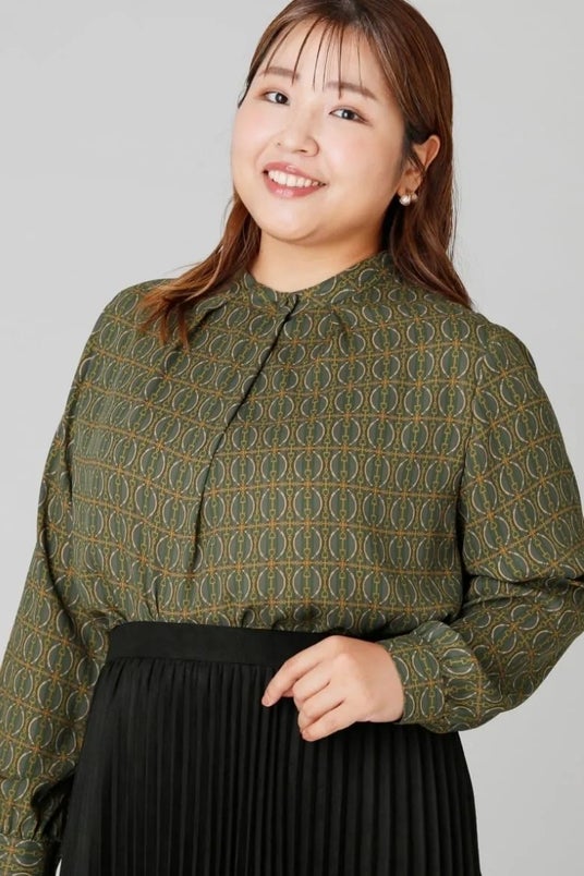 総柄ブラウスは くすみカラーで大人な表情に