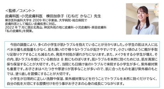 今回の調査を得て、スキンケア方法やアイテム、紫外線対策など、お子さんに最適な情報提供が、肌トラブルや紫外線対策に必要であると考えられました。本調査の監修をいただいた棟田加奈子先生からも、「小学生が日常的に正しい洗顔や保湿、紫外線対策などを行うことでトラブルを未然に防ぐ」というコメントをいただきました。