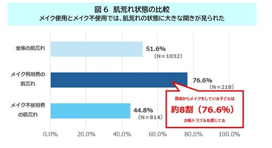 反面、普段からメイクをしているお子さんは、約8割が肌のトラブルを経験しており、全体の肌トラブル経験が約半数に対し、かなり多くの割合であることが分かりました(図6)。 また、メイク不使用のお子さんは、全体より少なく、約4割半であり、これらを踏まえてメイクによる一定の影響があると考えられます。特に日焼け後の肌荒れについては、メイクをしていることで乾燥などの肌荒れを感じやすくなっていることが考えられます。