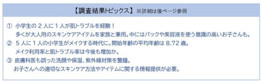 その結果、小学生の2人に1人が肌トラブルを経験、さらに、5人に1人の小学生が普段からメイクをし、そのうちの約8割が肌トラブルを経験している実態が明らかになりました。これは、保護者の方に必要な情報が十分に行き届いていないことから、お子さんに最適なスキンケア方法やアイテムに関する知識不足が一因と考えられます。皮膚科医からも誤った洗顔や保湿、紫外線対策を警鐘するなど、肌トラブル対策に関する適切なケア方法やアイテムなどの情報提供の必要性が読み取れる結果となりました。