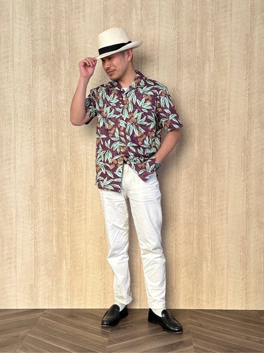 今年のKAHALAコラボのアロハシャツを自分なりに解釈したスタイルです。ハワイでは正装としても着用されるアロハシャツ。リゾートウェアの代表格ですが、あくまでも節度を持って着崩すことが大切。ホワイトの5ポケットとローファーといったアイビーなアイテムと組み合わせた、キレイめなアメカジテイストの提案です。遊び心でフェドラハットを被り、リゾート感も忘れずに演出。