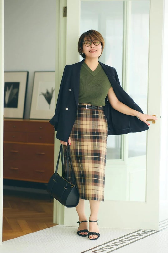 紺ブレ×チェックスカートだと、モノトーンで合わせがちですが、ここではアースカラーを合わせる事で、いわゆるプレッピーなかわいらしい印象とは違って、配色で魅せる『大人のトラッドスタイル』にコーディネートしてみました。アクセサリー感覚で合わせた眼鏡との相性も抜群です。