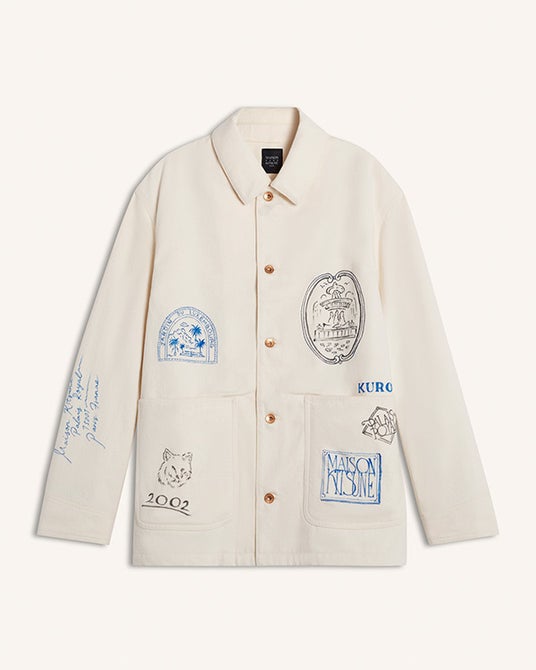 パリのランドマークから着想を得た手描きのポストカードモチーフを施したワークジャケットとセットアップのトラウザー。旅の思い出を身にまとうようなデザインです。