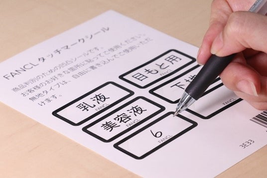 また、化粧品は同じ大きさや形の容器が多く、触っただけでは区別しにくいことから、使用アイテムがしっかり区別できるように当社独自のサービス「タッチマークシール」を紹介。実際に社内の視覚に障がいを持った従業員と一緒に開発をしたことや、点字ではなく、マークで区別できるので、誰でも簡単に区別できることを説明しました。