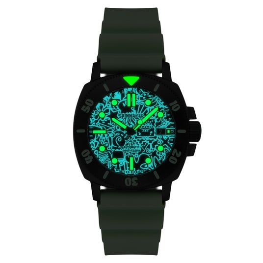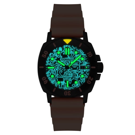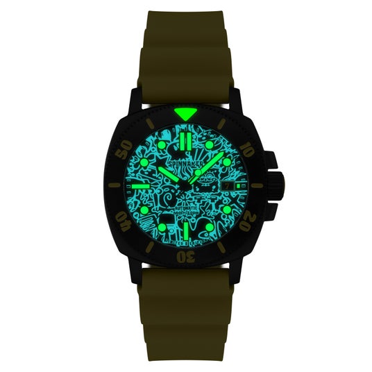 ハルオートマティック スポンジ・ボブ リミテッドエディションの最大の特徴は、文字盤にあります。ブランドネームや日付、機能表示に、『スポンジ・ボブ』の世界で使われているような楽しげなフォントを採用。さらに薄暗く描かれたグラフィック……実はUVライトを照らすことで、架空の海底都市「ビキニタウン」で笑顔を見せるスポンジ・ボブの姿が浮かび上がるのです。それはまるで、深海に隠された宝物のようにも見えます。