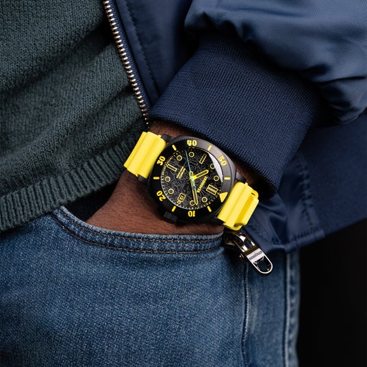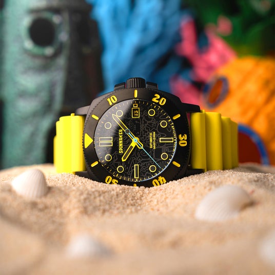 ハルオートマティックが『スポンジ・ボブ』コラボにふさわしい理由は、堅牢で実用的なダイバーズだという事実も挙げられます。200m防水と、深海で暮らす彼らに会いに行けそうなほど高い防水性を実現しています。また風防には耐傷性に優れたサファイアレンズを採用し、キズがつきにくくなっています。シリコンストラップは水に強く、マリンスポーツなどアクティブなシーンでの利用にもうってつけです。