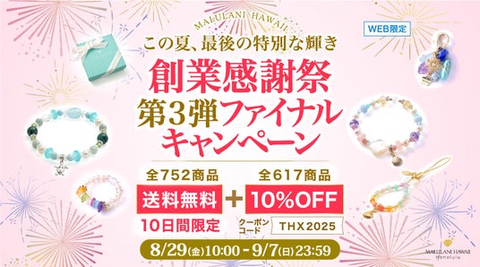ハワイ発祥の天然石アクセサリーブランド「マルラニハワイ」では、日頃のご愛顧に感謝を込めて、創業18周年記念「創業感謝祭 第3弾」として、オンラインショップ限定で送料無料&10%OFFキャンペーンを開催いたします。