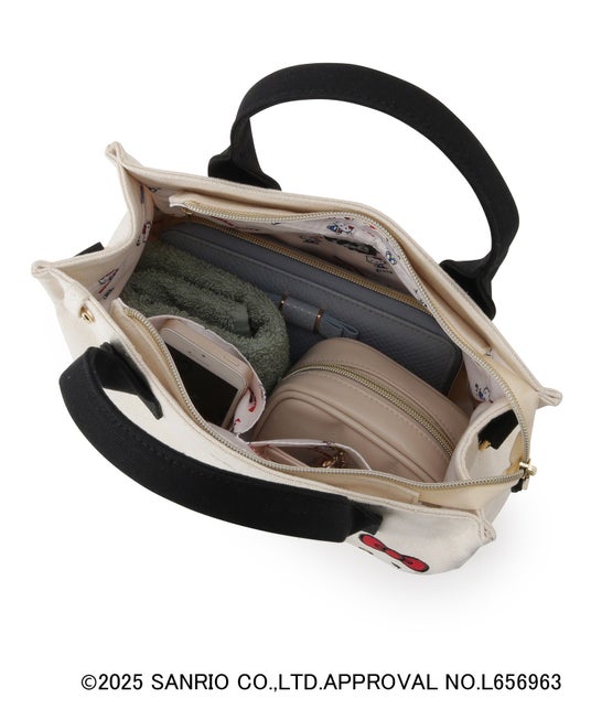 人気のスクエア型トートバッグに、ハローキティのお顔が刺繍されています。ショルダー付きの2WAY仕様で、お出かけに適した絶妙なサイズ感です。ハンドルの横にはチャームなどを付けられるDカンがあり、同コラボレーション商品のチャームポーチを付けるのがおすすめです。