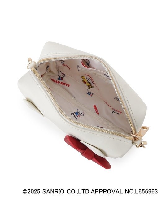 ハローキティのお顔が大きく刺繍され、立体的なリボンと耳がキュートなポーチです。チェーン付きで持ち歩きに便利で、バッグに付けてチャームのように使用することもできます。