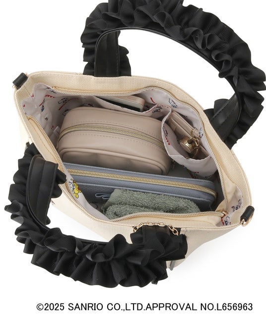 ひょっこりと覗くハローキティの刺繍が施されたトートバッグ。ハリのあるグログラン素材のフリルハンドルがさりげなくかわいいワンポイントです。ショルダーベルト付きの2WAY仕様で便利で使い勝手も抜群。しっかりしたマチとファスナー開閉で中身が見えにくく、安心してお使いいただけます。