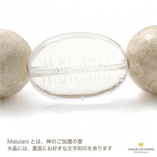 水晶には、ハワイ語で「神に護られた」という意味を持つ「malulani」と刻印。 持つ人に「神のご加護がありますように」との祈りをのせています。