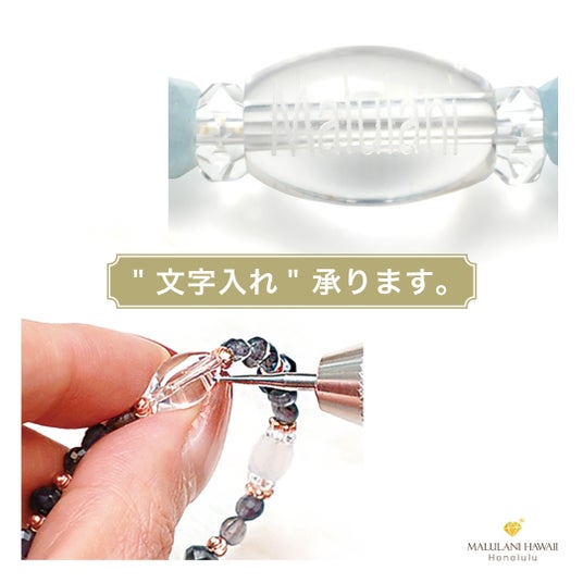 ご希望のかたには、プラス2,200円で、お好きな英数字を刻むことも可能。 お誕生日や記念日、お好きな数字や言葉を刻んだブレスレットは、特別なお守りとなるでしょう。