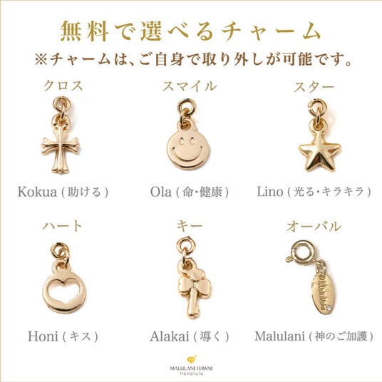 数珠ブレスレットにお付けするチャームは、ハワイの言葉を刻んだ5種類のチャームと、Malulaniと刻印のオーバルチャームからお選びいただけます。