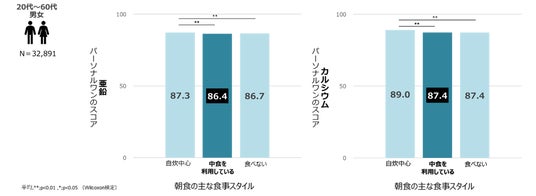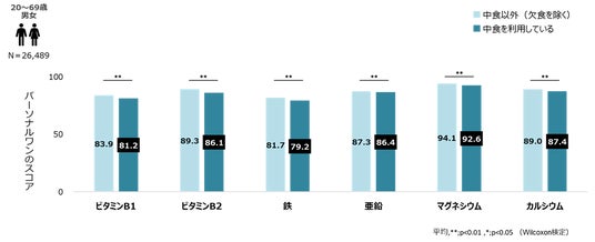 ※オーダーメイドサプリメント「パーソナルワン」初回購入時20歳から69歳の男女(33,246人)のうち、朝食を摂取している26,489人を対象に解析。朝食を「中食(市販のお弁当やインスタント食品、お総菜などの調理済み食品〔パンを含む〕)」と回答した人と、中食以外と回答した人(欠食者を除く)を比較した。
