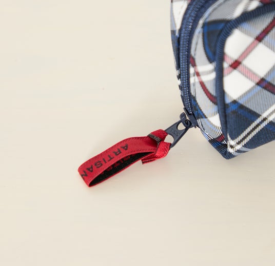 ころんとした角が可愛らしい印象のマチ付きスクエアポーチ。表地のニューヨーカータータンには弱撥水加工をほどこし、汚れが付きにくく、軽く水拭きが可能です。