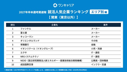 株式会社ファンケルは、就活支援サービス「ワンキャリア」を運営する株式会社ワンキャリア(本社:東京都渋谷区、代表取締役社長 執行役員CEO:宮下 尚之)の発表した「ワンキャリア 就活人気企業ランキング【エリア別編】(27卒本選考期速報)」において「関東(東京以外)1位」に選ばれました。また、「ワンキャリア 就活クチコミアワード2026」の総合部門においても「BRONZE」を獲得しました。