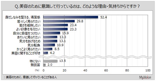 美容のために行っていることがある人に、意識して行う理由を聞いたところ(複数回答)、「身だしなみを整える、清潔感」が52.4%、「若々しく見られたい」が29.8%、「若さを維持したい」「よい印象を与えたい」が各2割強です。