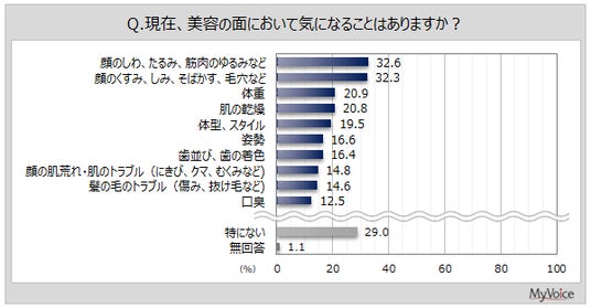 ■美容に関して気になることは「顔のしわ、たるみ、筋肉のゆるみ」「顔のくすみ、しみ、そばかす、毛穴」が各3割強、「体重」「肌の乾燥」「体型、スタイル」が2割前後