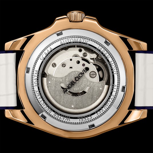 ブランドコンセプトの「センスオブファン」を体現すべく、時計の心臓部であるテンプの位置の文字盤をくり抜いたオープンハート仕様により、時を刻む動きを楽しめる。またムーブメントには信頼性の高い“SEIKO EPSON YN77”を採用。裏蓋もスケルトン仕様なので、着脱の際にローターの動きを感じることができる。
