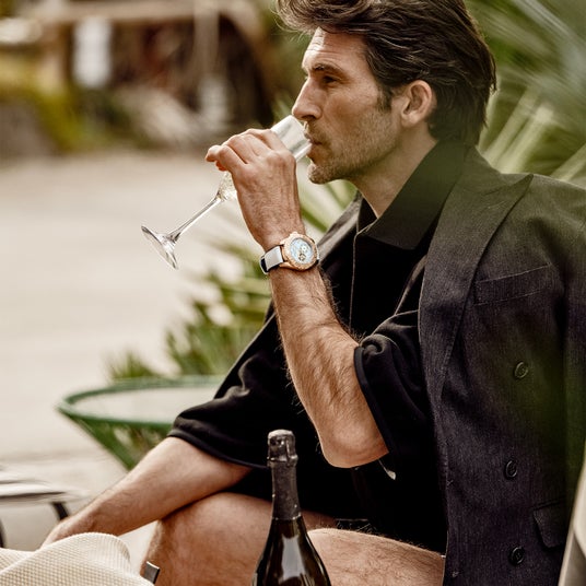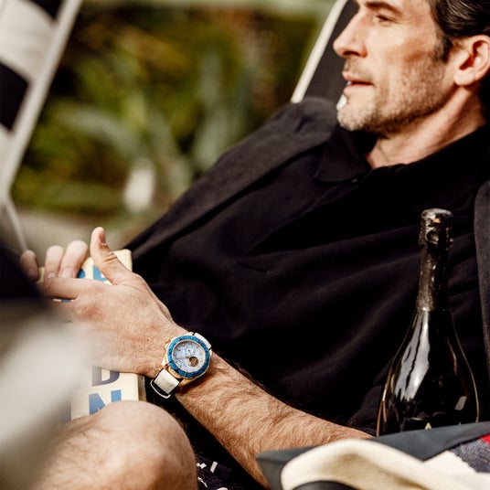 鮮やかで濃いブルーのベゼルと澄み渡る空のような薄いブルーのコントラストにより、夏の海を身近に感じさせる表情に。加えて品のあるゴールドのケースとリューズを組み合わせることでラグジュアリー感をプラス。アクティブさとエレガントさが同居するバランスのいい仕上がりは、シンプルな夏の装いを格上げしてくれること間違いありません。