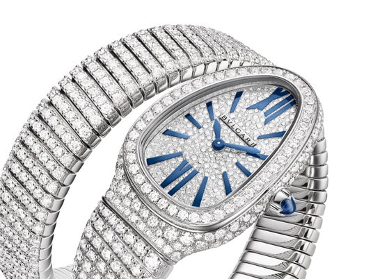 ホワイトゴールドにダイヤモンドをあしらった「セルペンティ インフィニティ」は、シングルツアーとダブルツアーで展開されます。ブルーの針とインデックスがダイヤモンドの輝きをさりげなく引き立てます。シングルツアーには978石のブリリアンカットダイヤモンド(約13.00ct)が、ダブルツアーには1344石のダイヤモンド(約20.00ct)がセットされ、ダイアル、ベゼル、ケース、そしてブレスレットのすべてのパーツに輝きを与えています。リューズにセットされたカボションカットのサファイアが、ケース全体に施されたダイヤモンドの魅力をさらに華やかなものにし、エレガントにナチュラルに手首を包み込みます。