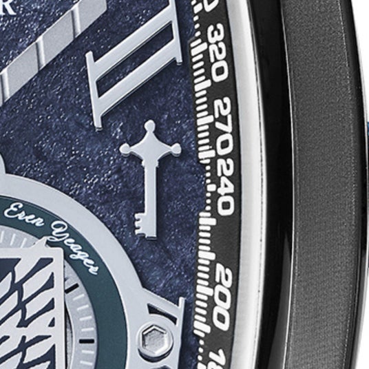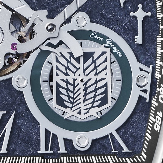 超硬質ブレードを再現した時分針を採用。調査兵団の「自由の翼」を象ったプレートが4時位置で1秒ごとに回転します。自由の翼の右上にはエレンの名前が刻まれています。