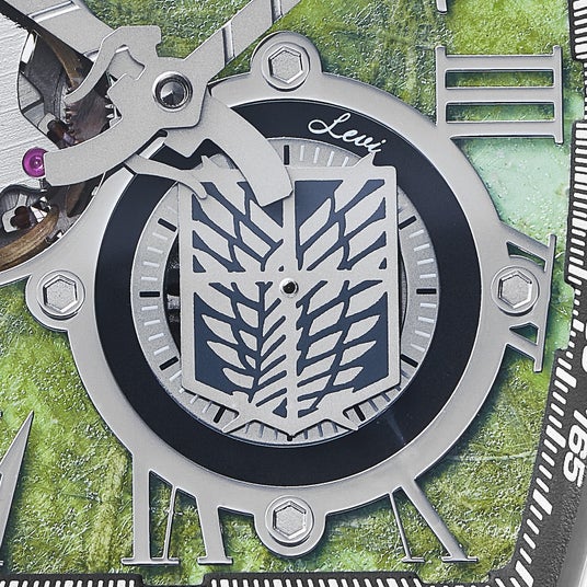 超硬質ブレードを再現した時分針を採用。調査兵団の「自由の翼」を象ったプレートが4時位置で1秒ごとに回転します。自由の翼の右上にはリヴァイの名前が刻まれています。