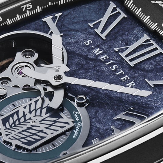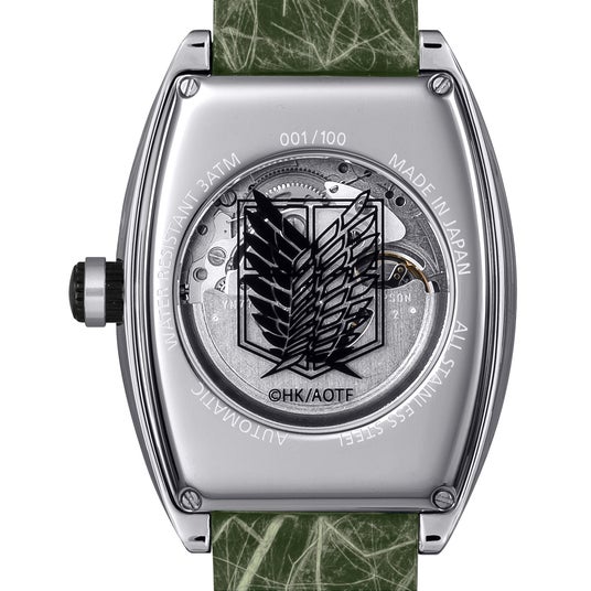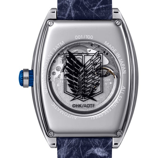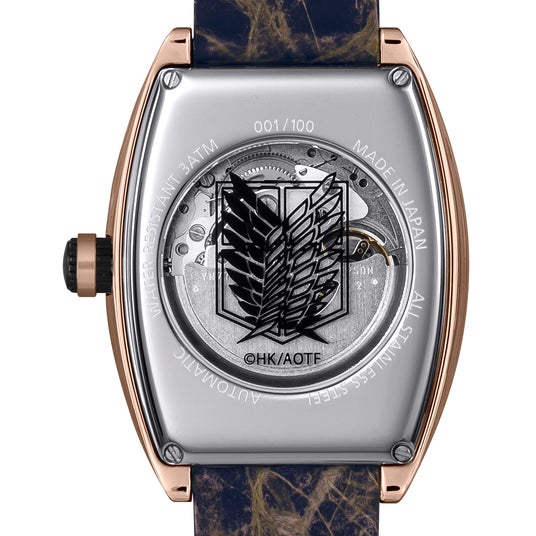 日本の伝統工芸「阿波和紙」を使用し、TVアニメ『進撃の巨人』のキャラクターを表現。作品ロゴのひび割れたような質感を和紙の質感を活かし、文字盤とベルトに再現しました。