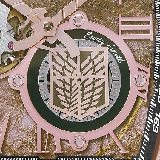 超硬質ブレードを再現した時分針を採用。調査兵団の「自由の翼」を象ったプレートが4時位置で1秒ごとに回転します。自由の翼の右上にはエルヴィンの名前が刻まれています。