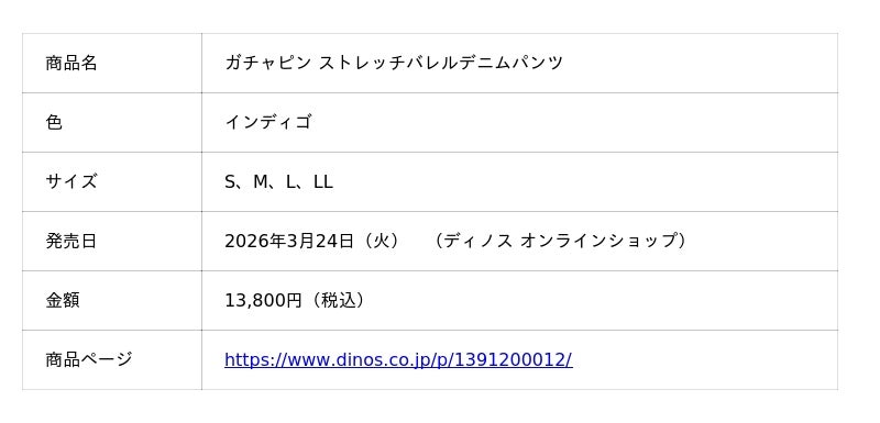 ガチャピン・ムックを黒の線画で描いたデニムアイテム 愛嬌たっぷりのふたりを黒の線画でデッサン風タッチに描いたデニムシャツとバレルデニムパンツです。通年で活躍する薄手のデニムシャツには、胸ポケットにガチャピン・ムックをレイアウトしました。ストレッチデニム素材でゆったりした履き心地のバレルパンツには、ちょっぴりへこんだような、なんともいとおしくてたまらない表情のガチャピンをデザインしました。これらの商品を掲載したファッションカタログ『DAMA collection +PLUS』2026夏号を4月1日(水)に発刊し配布するほか、『ディノス オンラインショップ』では3月から販売いたします。