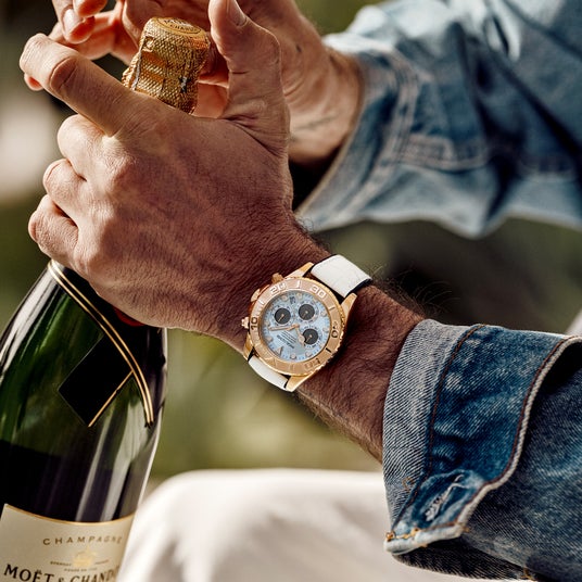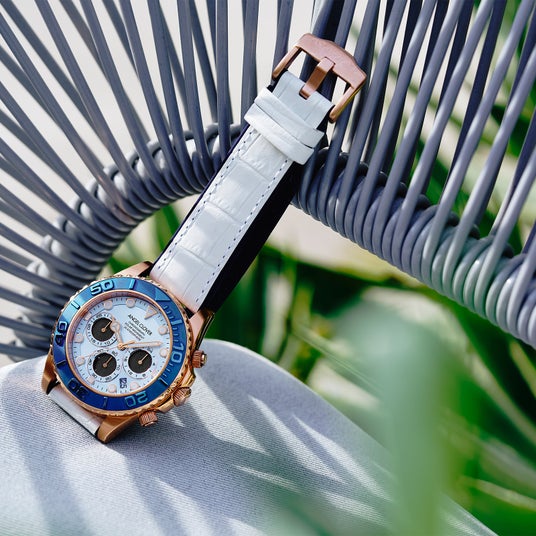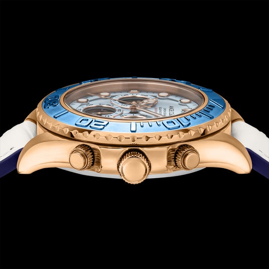 ケース・ベゼル・リューズをゴールドで纏った、公式オンラインショップ限定カラー。45mm径のビックフェイスにラグジュアリーな雰囲気のゴールドベゼルはインパクト絶大。ブルーベゼルもゴールドベゼルも文字盤の淡いブルーと相まって、ときに力強く、ときに爽快な夏のスタイルアップを叶えてくれます。