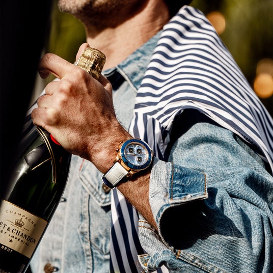 リュクスな雰囲気を醸すブルーのベゼルに、光沢感のあるメタリックのゴールドのケースが程よいアクセントとなり、スポーティなデザインの中にも高級感を演出。ベゼルを強調したフェイスが男らしさを引き出し、アクティブな夏の装いに華をそえてくれること請け合いです。