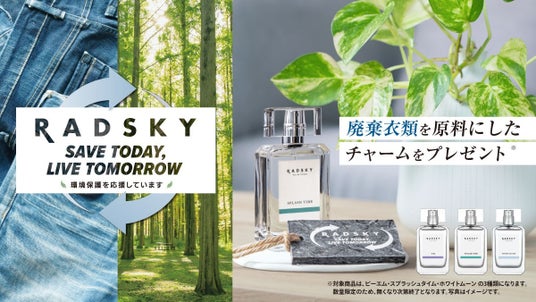 RADSKYの中でも人気の香り3種類「スプラッシュタイム」「ピーエム」「ホワイトムーン」を対象に、数量限定でサステナブル素材のオリジナルチャーム付き商品を販売します。