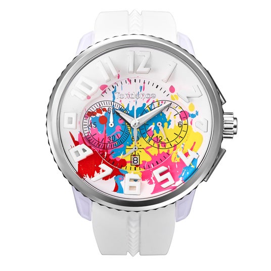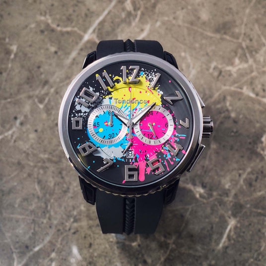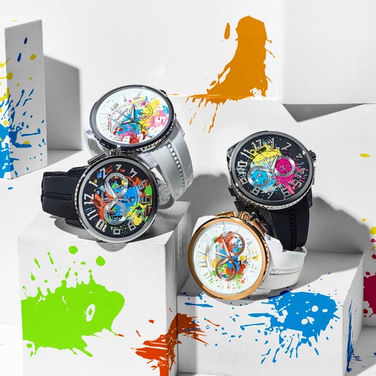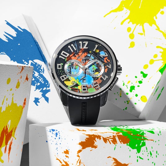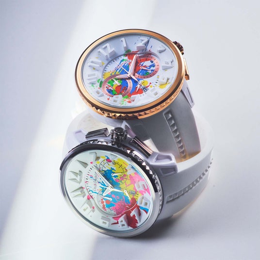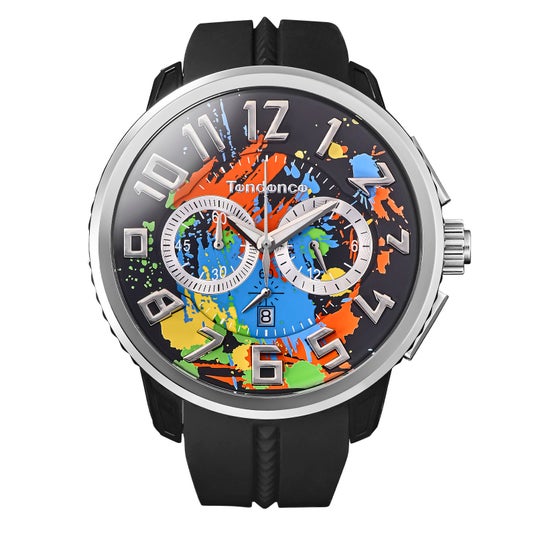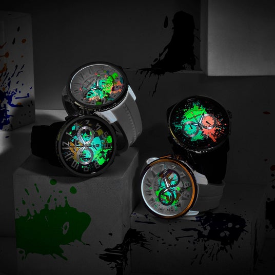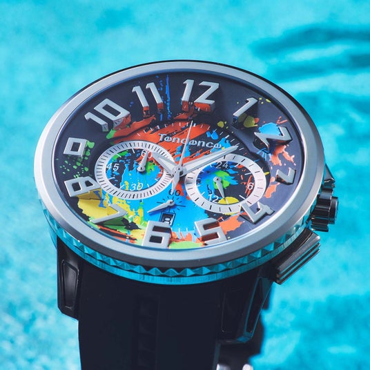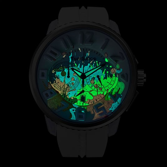 色彩がキャンバスに飛び散る「アクション・ペインティング」のようなアートを文字盤に大胆にデザイン。蓄光パウダーを練り込んだ特殊な塗料を採用し、闇夜でもインク部分が鮮やかに浮かび上がります。時分針も蓄光仕様で夜間の時間視認も容易です。