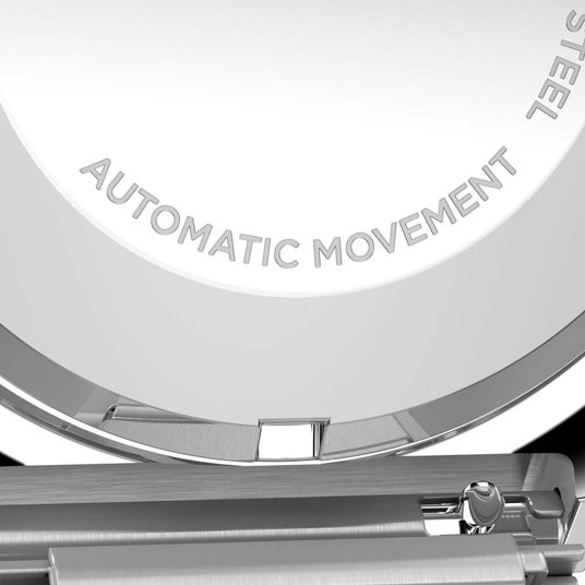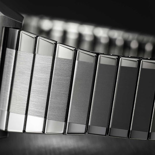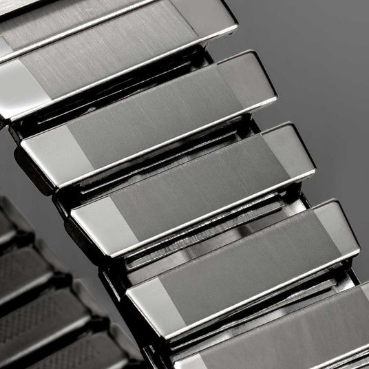 ケースからベルトの中央につながる部分はヘアライン加工を施すことで一体感を。またベルトの両サイドはポリッシュ加工と使い分け。絶妙なコントラストを醸すのはもちろん、両サイドを鏡面仕上げにすることで、引き締まった印象を与えてくれる。