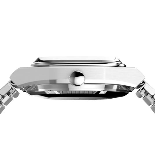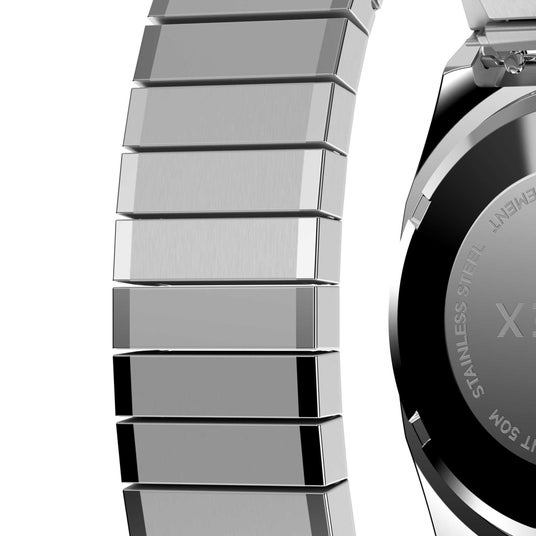ブレス自体がゴムのように伸びて着脱がしやすい蛇腹式のエクスパンションブレスレットを採用。さらにレトロな見た目はそのままに、コマの腹部分を押して工具を使わずコマを外してサイズ調整ができる新機構「パーフェクトフィットテクノロジー」を搭載。簡単に自分の腕へジャストフィットさせることができます。