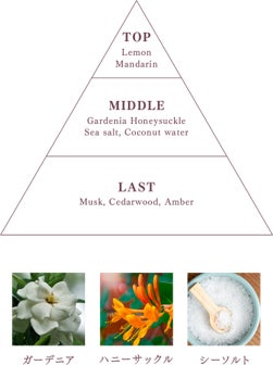 初夏を彩るガーデニア、ハニーサックルによる穏やかなマリンフローラルの甘さを、海風を感じるさわやかなシーソルトの香りが引き立てています。