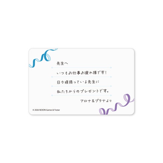 アロナとプラナからのメッセージカードをイメージし、いつもお仕事を頑張っている先生へのメッセージが記されています。