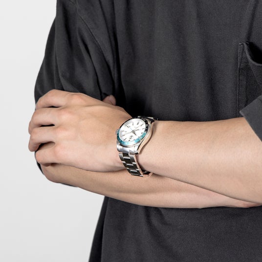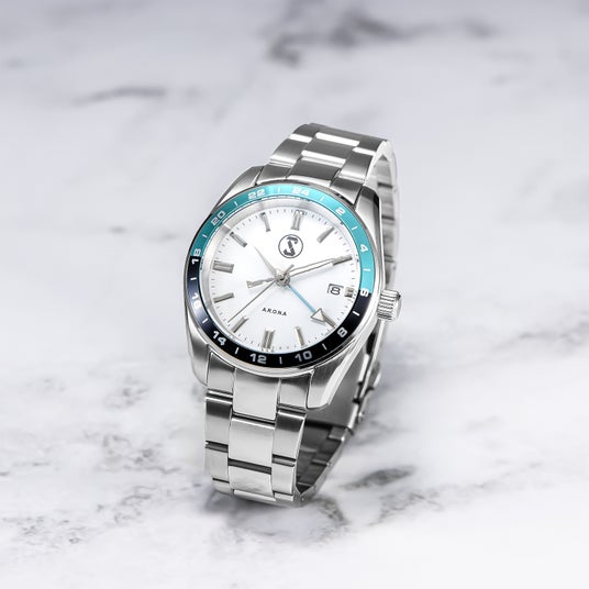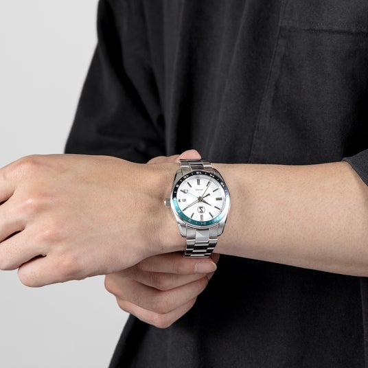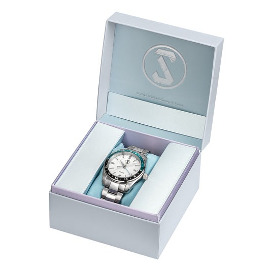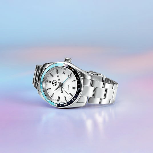 39mmと程良いケースサイズで、メンズ・レディースどちらにも腕馴染みの良いサイズ感です。時計の心臓部には日本製自動巻きムーブメント(SEIKO NH34)を搭載しており、高い信頼性を誇ります。第二時間帯を表示するGMT機能を搭載し、2トーンカラーのベゼルはアロナとプラナのイメージカラーをレイアウト。時針は二人の傘をモチーフにしたデザインに仕上がっています。防水性能は10気圧防水となっており、日常生活における十分な防水性が備わっています。