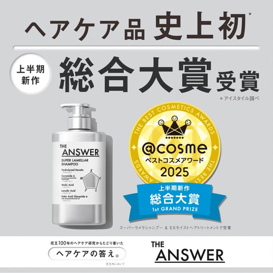 花王株式会社のヘアケアブランド「THE ANSWER(ジアンサー)」の「スーパーラメラシャンプー&EXモイストヘアトリートメント」は、「@cosmeベストコスメアワード2025 上半期新作ベストコスメ」の「総合大賞」を受賞しました。ヘアケア品が、上半期新作ベストコスメの総合大賞を受賞するのは、史上初*1 となります。また、「ベストシャンプー・トリートメント 第1位」「@cosme SHOPPING ベストヒット賞 総合 第1位」など、「THE ANSWER」ブランド全体で、部門賞も5件受賞しました。