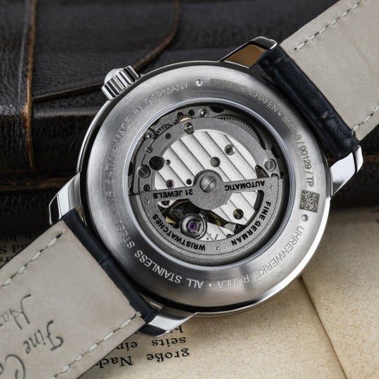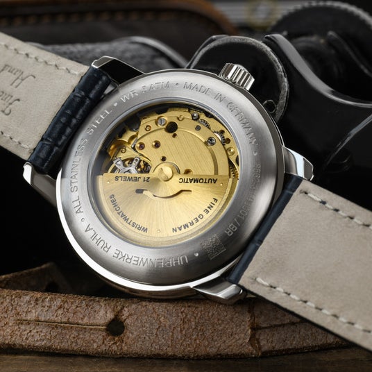 代表的なモデルに見られるドーム型のガラス風防や、周縁部に向けてカーブする文字盤などをはじめとする高品質なパーツを随所に採用。ドイツ国内の工場で「MADE IN GERMANY」を掲げるために必要な厳しい基準をクリアした高い品質を保っています。