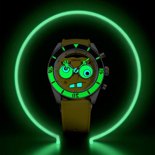 『スポンジ・ボブ』は架空の海底都市「ビキニタウン」での日常を描いた作品であることから、海の中でも使えるよう、暗所で明るく光るスイス製スーパー・ルミノバを採用しました。針やサブダイヤル、逆回転防止ベゼルに加え、6時位置に描かれた口元のデザインにまで塗布され、どこにいても彼の存在を身近に感じることができます。