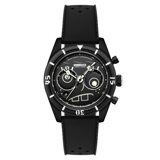 今回のコラボレーションで起用されたフルース クロノグラフは、ヴィンテージな趣を宿したダイバーズウォッチです。クラシカルなケースフォルムや盛り上がった強化ガラス付き回転ベゼルは一際の個性を放つ存在で、スポンジ・ボブのアイデンティティを的確に表現しています。日本製のメカクォーツクロノグラフムーブメント「SII-VK64」を搭載し、精確で安定した時を刻みます。